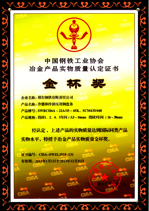 Wire SWRCH6A~22A/35~45K and SCM435/440 for cold forging awarded the Gold Cup Prize of Metallurgy products.