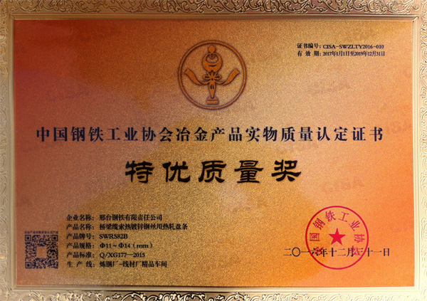 橋梁纜索熱鍍鋅鋼絲用熱軋盤(pán)條SWRS82BΦ11~Φ14(mm)獲得冶金產(chǎn)品實(shí)物質(zhì)量“特優(yōu)質(zhì)量獎(jiǎng)”