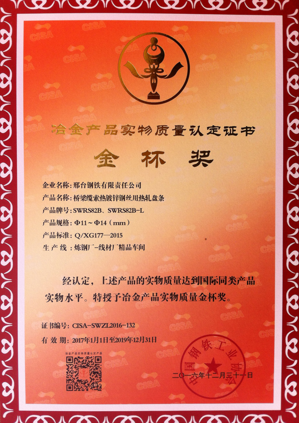 橋梁纜索熱鍍鋅鋼絲用熱軋盤(pán)條SWRS82B、SWRS82B-L Φ11~Φ14(mm)獲得冶金產(chǎn)品實(shí)物質(zhì)量“金杯獎(jiǎng)”