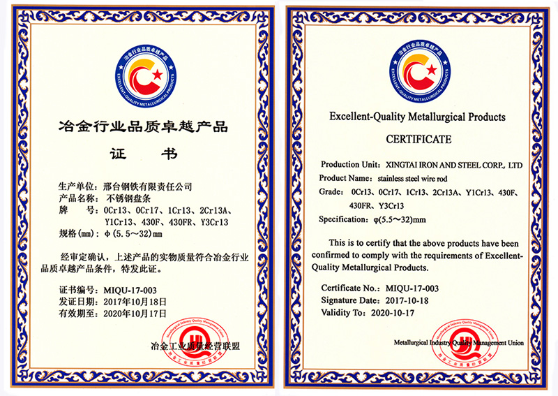 不銹鋼盤(pán)條0Cr13、0Cr17、1Cr13、2Cr13A、Y1Cr13、430F、430FR、Y3Cr13共8個(gè)牌號(hào)φ5.5- 32mm規(guī)格獲冶金行業(yè)品質(zhì)卓越產(chǎn)品