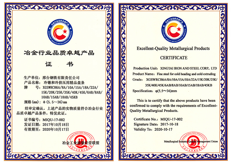 冷鐓和冷擠壓用精品盤(pán)條XGSWRCH6A/8A/10A/15A/18A/22A/15K/20K/25K/35K/40K/45K/6AB/8AB/10AB/15AB/18AB/45KB共18個(gè)牌號(hào)φ5.5- 36mm規(guī)格獲冶金行業(yè)品質(zhì)卓越產(chǎn)品
