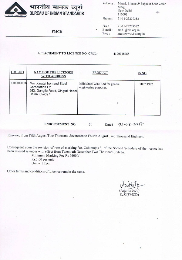 邢鋼申請(qǐng)印度BIS認(rèn)證的6個(gè)產(chǎn)品牌號(hào)(對(duì)應(yīng)邢鋼49個(gè)產(chǎn)品牌號(hào))通過(guò)印度國(guó)家認(rèn)證