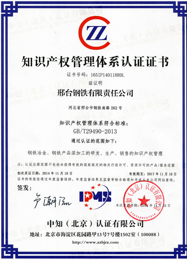 2014年11月10日,邢鋼通過GB/T29490-2013認證,中知(北京)認證有限公司向邢鋼頒發(fā)了《知識產權管理體系認證證書》。