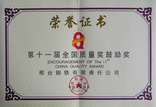 2011年10月,邢鋼榮獲“第十一屆全國質(zhì)量獎鼓勵獎”。