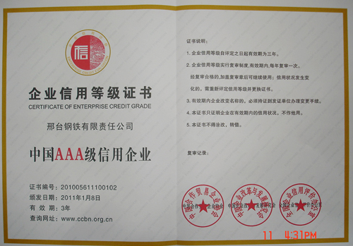 2011年1月,邢鋼被評選為“中國AAA級信用企業(yè)”。