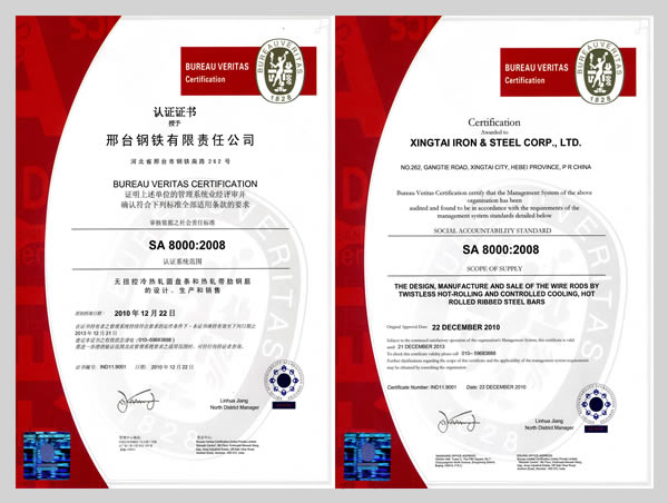 2010年12月22日,邢鋼在全國鋼鐵行業(yè)中首家通過SA8000社會責任體系認證。