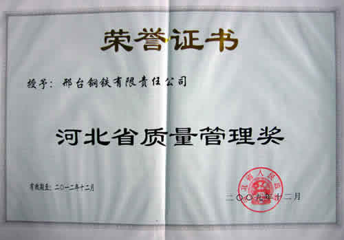 2009年12月,河北省政府授予邢鋼“河北省質(zhì)量管理獎”。