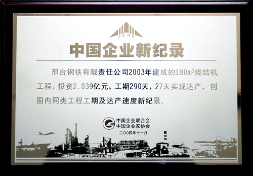 2004年11月,邢鋼2003年建成的180m3燒結(jié)機工程,投資2.039億元,工期290天,27天實現(xiàn)達產(chǎn),創(chuàng)國內(nèi)同類工程工期及達產(chǎn)速度新紀錄。