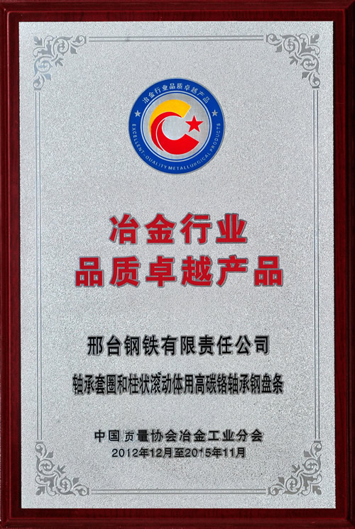 2012年度,中國質量協(xié)會冶金分會對我公司申報的“冶金行業(yè)品質卓越產品”進行了受理評價。邢鋼公司生產的規(guī)格φ5.5-16mm 軸承鋼GCr15 獲得“冶金行業(yè)品質卓越產品”榮譽稱號,為進一步拓展市場、滿足高端用戶的質量需求提供了質量保證能力。