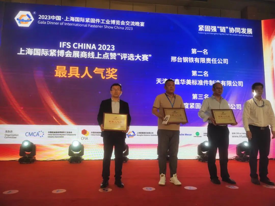 5月22日獲悉,在2023中國上海國際緊固件工業(yè)博覽會(huì)上,邢臺(tái)鋼鐵有限責(zé)任公司榮獲IFS CHINA 2023 上海國際緊博會(huì)展商線上點(diǎn)贊“評(píng)選大賽”第一名,獲得“最具人氣獎(jiǎng)”獎(jiǎng)項(xiàng),并被授予獎(jiǎng)杯及證書。