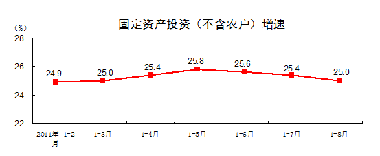 2011年1-8月份,固定資產(chǎn)投資(不含農(nóng)戶)180608億元,同比增長(zhǎng)25%,比1-7月份回落0.4個(gè)百分點(diǎn)。其中,國(guó)有及國(guó)有控股投資62422億元,增長(zhǎng)12.1%。從環(huán)比看,8月份固定資產(chǎn)投資(不含農(nóng)戶)增長(zhǎng)1.16%。