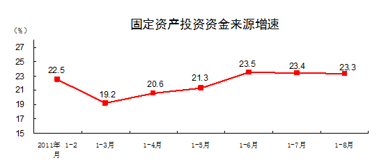 從到位資金情況看,1-8月份,到位資金212194億元,同比增長(zhǎng)23.3%。其中,國(guó)家預(yù)算內(nèi)資金增長(zhǎng)13.1%,國(guó)內(nèi)貸款增長(zhǎng)9%,自籌資金增長(zhǎng)29.4%,利用外資增長(zhǎng)14.1%,其他資金增長(zhǎng)17.3%。