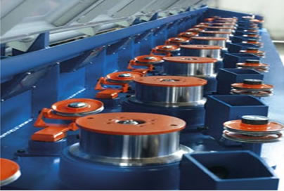 2、線材由放線機(jī)進(jìn)入拉絲機(jī)。經(jīng)過八次拉拔和八次卷筒冷卻,實(shí)現(xiàn)Φ4.9mm線材到Φ2.1mm線材的軋制。在最后一個(gè)卷筒后面,裝有一個(gè)舞臂單元,使拉絲機(jī)和收線機(jī)/收卷機(jī)保持同步。