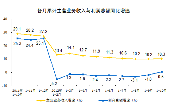 1-10月份,全國規(guī)模以上工業(yè)企業(yè)實(shí)現(xiàn)利潤40240億元,同比增長0.5%。10月當(dāng)月實(shí)現(xiàn)利潤5001億元,同比增長20.5%。