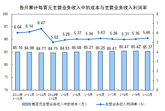 規(guī)模以上工業(yè)企業(yè)實(shí)現(xiàn)主營業(yè)務(wù)收入736970億元,同比增長10.3%。每百元主營業(yè)務(wù)收入中的成本為85.37元,主營業(yè)務(wù)收入利潤率為5.46%。