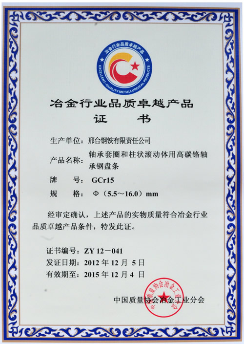 邢鋼公司生產(chǎn)的規(guī)格φ5.5-16mm 軸承鋼GCr15 獲得“冶金行業(yè)品質(zhì)卓越產(chǎn)品”榮譽稱號,為進一步拓展市場、滿足高端用戶的質(zhì)量需求提供了質(zhì)量保證能力。