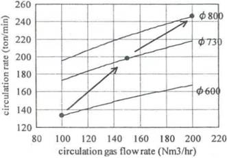 提高鋼水循環(huán)流量是加速RH脫碳的主要手段。提高提升氣體流量,增大浸漬管直徑,降低真空室壓力,均能增大循環(huán)流量,加速脫碳速率,其中浸漬管直徑變化的影響最大。浸漬管內(nèi)徑和提升氣體流量對循環(huán)流量的影響如下圖所示。