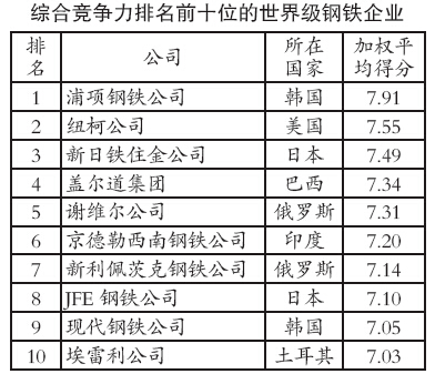 世界鋼動態(tài)公司自2002年以來每年都會對全球鋼鐵企業(yè)在生產(chǎn)規(guī)模、產(chǎn)能擴張、國內(nèi)市場議價能力、高附加值產(chǎn)品生產(chǎn)、技術創(chuàng)新能力、削減成本能力、盈利能力、資產(chǎn)負債平衡、市場結盟及下游業(yè)務開拓等23個方面進行評估,并發(fā)布世界級鋼鐵企業(yè)競爭力綜合排名。