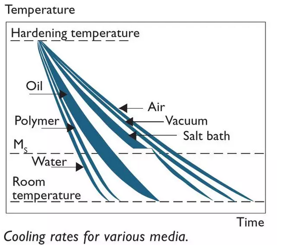 緩慢淬火導(dǎo)致部件的表面和芯之間的較小溫度差,并且不同厚度的部分將具有更均勻的冷卻速率。在低于Ms溫度的馬氏體范圍內(nèi)淬火時(shí),這是非常重要的。