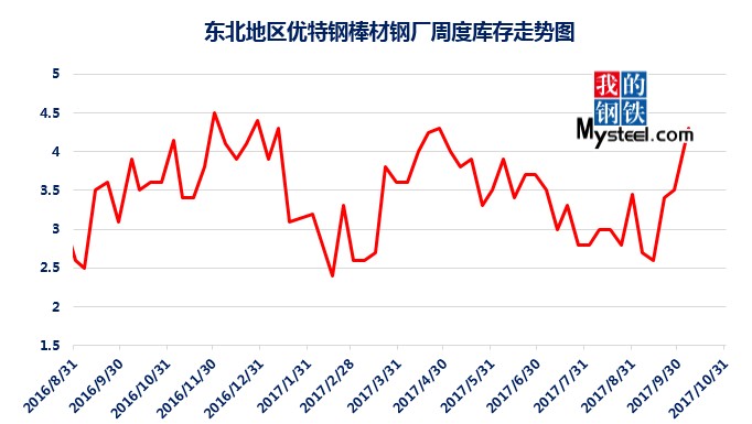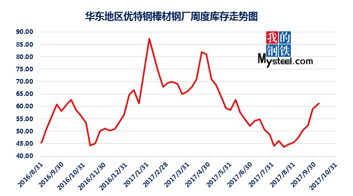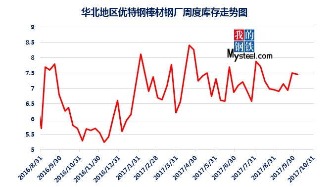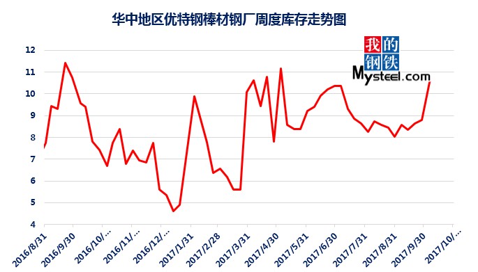 據(jù)mysteel統(tǒng)計(jì)的樣本優(yōu)特鋼廠庫(kù)存顯示,現(xiàn)全國(guó)優(yōu)特鋼廠棒材總庫(kù)存86.92萬(wàn)噸,較國(guó)慶節(jié)前增加5.67萬(wàn)噸,環(huán)比增加6.5%,較2016年國(guó)慶節(jié)后第一周庫(kù)存低0.31萬(wàn)噸,較2016年均值高9.61萬(wàn)噸,上漲12.43%。2017年內(nèi)均值為84.43萬(wàn)噸,當(dāng)前庫(kù)存較均值增加2.49萬(wàn)噸。樣本鋼廠總庫(kù)存連續(xù)7周上漲。