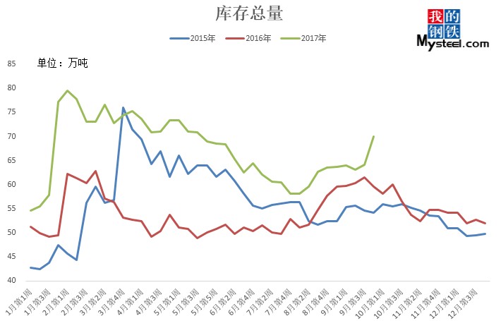 據(jù)Mysteel對(duì)全國(guó)25個(gè)市場(chǎng)的貿(mào)易商和倉(cāng)庫(kù)跟蹤,現(xiàn)全國(guó)優(yōu)特鋼棒材樣本總庫(kù)存69.99萬(wàn)噸,較國(guó)慶節(jié)前增加5.86萬(wàn)噸,環(huán)比增加9.14%;較2016年國(guó)慶節(jié)后第一周增加10.34萬(wàn)噸,同比增加17%。