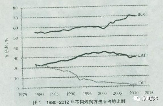 自此,氧氣轉(zhuǎn)爐煉鋼得到快速發(fā)展,而平爐煉鋼開始下降,如圖1所示。氧氣轉(zhuǎn)爐煉鋼發(fā)展超過平爐煉鋼的一個(gè)重要因素是連鑄技術(shù)的引進(jìn)。連鑄要求鋼水源源不斷供應(yīng),而氧氣轉(zhuǎn)爐的工藝時(shí)間比較短,能很容易地滿足連鑄的鋼水供應(yīng),一個(gè)大轉(zhuǎn)爐(350t)的產(chǎn)鋼速度為500t/h。與此相對照,如果平爐常規(guī)操作,煉鋼至出鋼需要12—14h,或者如果借助工業(yè)用氧加速也需要7—8h。目前在烏克蘭、俄羅斯和印度仍然存在一定數(shù)量的平爐冶煉。這些爐子正逐步被電弧爐取代,2012年平爐工藝總產(chǎn)鋼量1690萬t,約占全球鋼產(chǎn)量的1.1%。