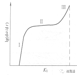 當(dāng)裂紋尖端的KI>KISCC時,裂紋就會不斷擴(kuò)展。單位時間內(nèi)裂紋的擴(kuò)展量叫做應(yīng)力腐蝕裂紋擴(kuò)展速率,用da/dt表示。裂紋的擴(kuò)展速率da/dt隨著應(yīng)力強(qiáng)度因子K1而變化。