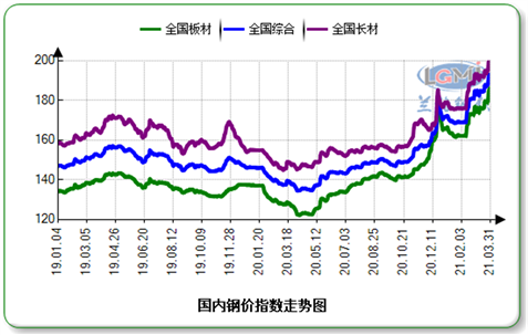 一季度,在需求提振、成本支撐、環(huán)保加碼、國(guó)內(nèi)外大宗商品整體上漲帶動(dòng)下,國(guó)內(nèi)鋼鐵市場(chǎng)震蕩上行,據(jù)蘭格鋼鐵云商平臺(tái)監(jiān)測(cè)數(shù)據(jù)顯示,一季度,蘭格鋼鐵綜合鋼材價(jià)格指數(shù)均值為177,同比上升22.5%;長(zhǎng)材價(jià)格指數(shù)為184.2,同比上升22.5%;板材價(jià)格指數(shù)為169.7,同比上升29.0%。從鋼材均價(jià)來(lái)看,一季度蘭格鋼鐵綜合鋼材均價(jià)為4868元/噸,較上年同期上漲同比上漲977元/噸,同比上漲25.1%。