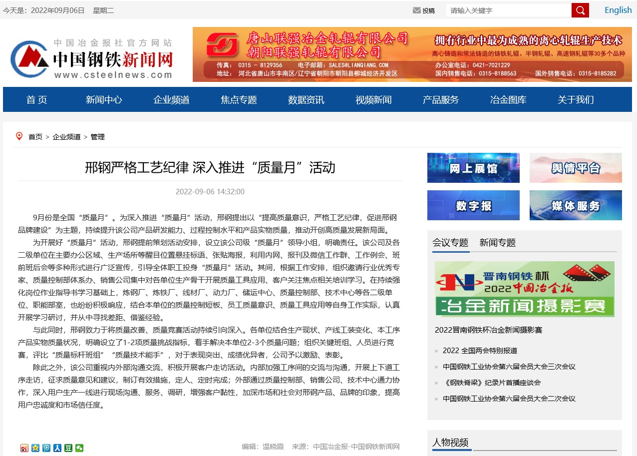 9月份是全國“質(zhì)量月”。為深入推進(jìn)“質(zhì)量月”活動,邢鋼提出以“提高質(zhì)量意識,嚴(yán)格工藝紀(jì)律,促進(jìn)邢鋼品牌建設(shè)”為主題,持續(xù)提升該公司產(chǎn)品研發(fā)能力、過程控制水平和產(chǎn)品實(shí)物質(zhì)量,推動開創(chuàng)高質(zhì)量發(fā)展新局面。