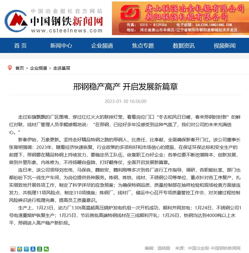 生產(chǎn)上,1月23日,動力廠130t高溫超高壓鍋爐發(fā)電機(jī)組一次開機(jī)成功,順利并網(wǎng)發(fā)電;1月24日,不銹鋼公司1號電渣重熔爐恢復(fù)生產(chǎn);1月25日,節(jié)后首批高端特鋼線材在三線順利開軋;1月26日,鐵鋼均達(dá)到4000噸以上水平,邢鋼進(jìn)入高產(chǎn)穩(wěn)產(chǎn)新階段。