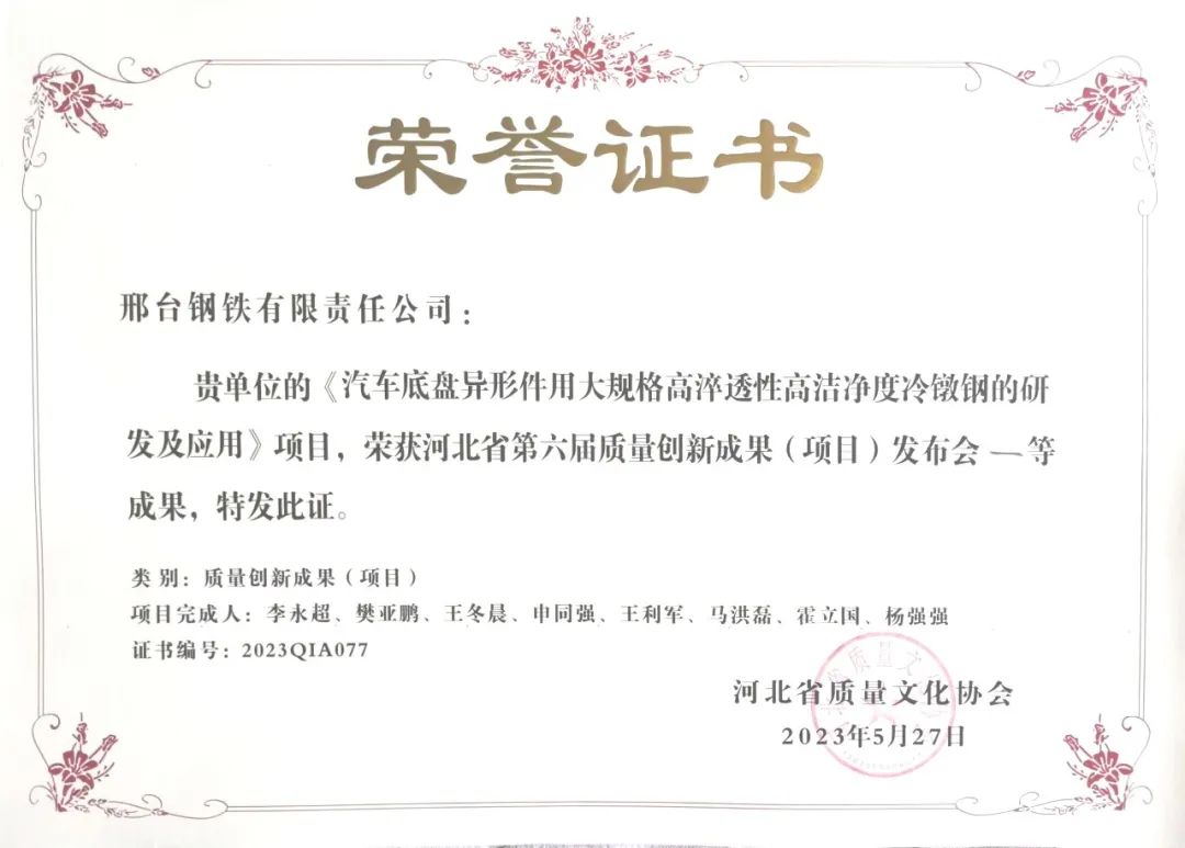 從近日召開(kāi)的河北省第六屆質(zhì)量創(chuàng)新成果(項(xiàng)目)發(fā)布會(huì)上獲悉:邢臺(tái)鋼鐵有限責(zé)任公司(以下簡(jiǎn)稱(chēng)邢鋼)再次斬獲多項(xiàng)省級(jí)質(zhì)量創(chuàng)新成果殊榮,其中:《汽車(chē)底盤(pán)異形件用大規(guī)格高淬透性高潔凈度冷鐓鋼的研究及應(yīng)用》、《提高超低碳鋼成品碳含量≤50ppm比例》、《優(yōu)質(zhì)碳素鋼拉拔斷裂問(wèn)題的改善與研究》榮獲示范級(jí)質(zhì)量創(chuàng)新成果;《提高6#高爐生鐵產(chǎn)量》和《全流程能效監(jiān)管系統(tǒng)的搭建與應(yīng)用》榮獲專(zhuān)業(yè)級(jí)質(zhì)量創(chuàng)新成果;《降低成品線材擦劃傷率》榮獲改進(jìn)級(jí)質(zhì)量創(chuàng)新成果。