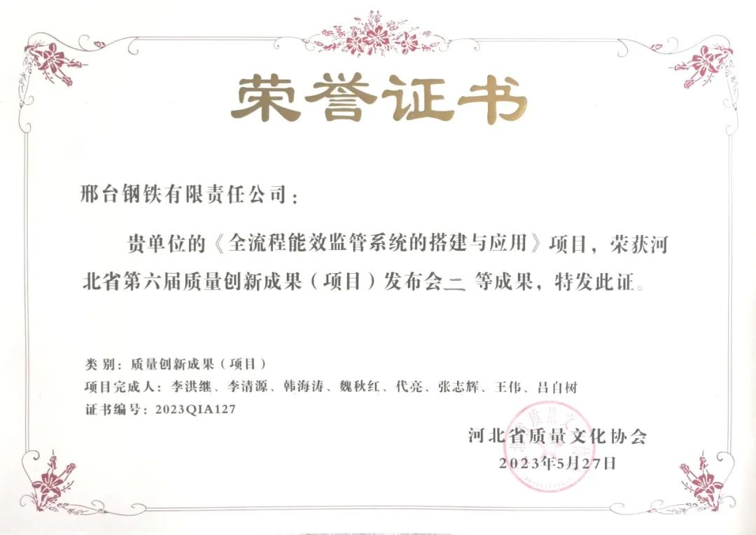 多年來(lái),秉承“干成事”的核心價(jià)值觀,積極踐行特鋼精品戰(zhàn)略,邢鋼在轉(zhuǎn)型升級(jí)的高質(zhì)量發(fā)展過(guò)程中,走出了一條創(chuàng)新型標(biāo)桿道路。作為河北省質(zhì)量文化協(xié)會(huì)會(huì)員單位,邢鋼已連續(xù)多年應(yīng)邀參加“河北省質(zhì)量創(chuàng)新成果發(fā)布會(huì)”,截至目前,邢鋼已經(jīng)累計(jì)榮獲河北省質(zhì)量創(chuàng)新示范級(jí)成果12項(xiàng)、專(zhuān)業(yè)級(jí)成果11項(xiàng)、改進(jìn)級(jí)成果5項(xiàng)。