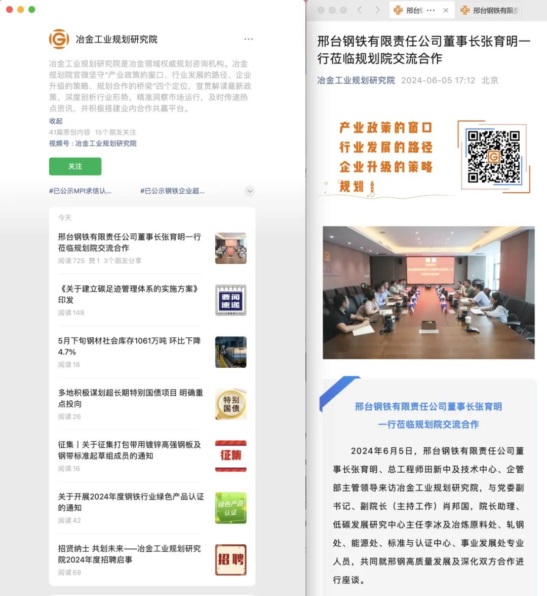2024年6月5日,邢臺鋼鐵有限責(zé)任公司黨委書記、董事長張育明在總工程師兼董事長、總經(jīng)理助理田新中及技術(shù)中心、企管部相關(guān)負(fù)責(zé)人的陪同下,到訪冶金工業(yè)規(guī)劃研究院,與黨委副書記、副院長(主持工作)肖邦國,院長助理、低碳發(fā)展研究中心主任李冰及冶煉原料處、軋鋼處、能源處、標(biāo)準(zhǔn)與認(rèn)證中心、事業(yè)發(fā)展處專業(yè)人員,共同就邢鋼高質(zhì)量發(fā)展及深化雙方合作進(jìn)行座談。