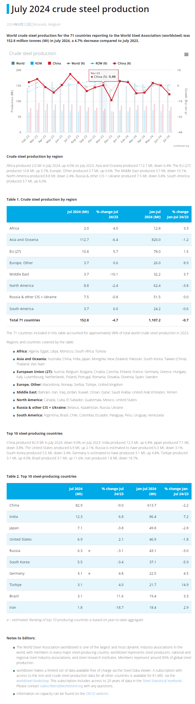來源:世界鋼鐵協會 發(fā)布時間:2024年08月27日 點擊數: