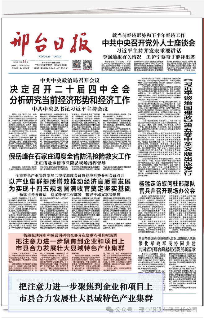 楊猛在調(diào)研中強調(diào),沙河玻璃、邢臺特鋼在我市傳統(tǒng)產(chǎn)業(yè)轉(zhuǎn)型升級中具有代表性和示范性,各級各相關(guān)部門要認真落實省、市委全會精神,緊緊圍繞“投資消費質(zhì)效年”工作主線,把注意力進一步向企業(yè)和項目聚焦,潛心抓產(chǎn)業(yè),以有效投資推動產(chǎn)業(yè)集群發(fā)展壯大。要常態(tài)化問需于企,強化土地、資金、政策等要素保障,實打?qū)崕椭髽I(yè)解決困難問題,以一流營商環(huán)境為企業(yè)發(fā)展增動能、強信心。要深入推進邢商回邢、以商招商,吸引更多上下游配套企業(yè)來邢投資發(fā)展,加快延長產(chǎn)業(yè)鏈,提升產(chǎn)品市場競爭力。