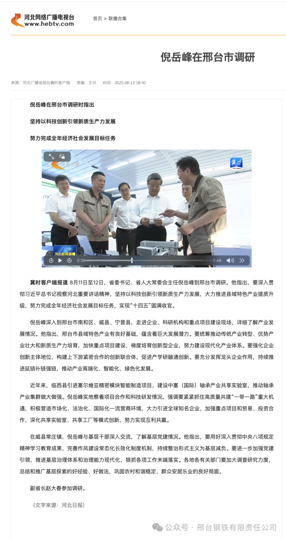 冀時客戶端報道 8月11日至12日,省委書記、省人大常委會主任倪岳峰到邢臺市調(diào)研。他指出,要深入貫徹習(xí)近平總書記視察河北重要講話精神,堅持以科技創(chuàng)新引領(lǐng)新質(zhì)生產(chǎn)力發(fā)展,大力推進(jìn)縣域特色產(chǎn)業(yè)提質(zhì)升級,努力完成全年經(jīng)濟(jì)社會發(fā)展目標(biāo)任務(wù),實現(xiàn)“十四五”圓滿收官。